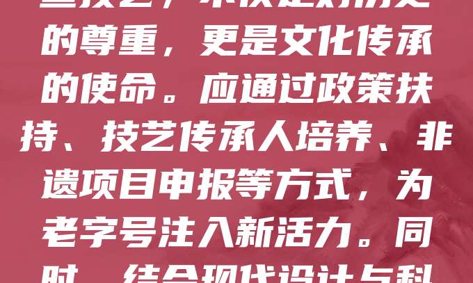 丝绸老字号承载着中华传统工艺的精髓,其技艺不仅体现匠心精神,更蕴含深厚的文化价值。然而,随着工业化进程加快,许多传统织造技艺面临失传风险。保护这些技艺,不仅是对历史的尊重,更是文化传承的使命。应通过政策扶持、技艺传承人培养、非遗项目申报等方式,为老字号注入新活力。同时,结合现代设计与科技手段,推动传统丝绸技艺与市场接轨,让古老技艺焕发新生。唯有坚守与创新并重,才能让丝绸老字号在新时代继续绽放光彩,延续千年文明之光。