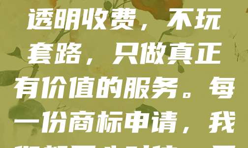 商标申请268元,看似价格实惠,但背后却暗藏猫腻。一些机构以低价吸引客户,实则通过加价服务、捆绑收费等方式赚取差价,损害消费者利益。而我们坚持透明收费,不玩套路,只做真正有价值的服务。每一份商标申请,我们都用心对待,只为赢得您的信任与口碑。选择我们,不仅是选择一个价格,更是选择一份安心与专业。让我们一起守护品牌,用实力说话,用口碑赢未来!