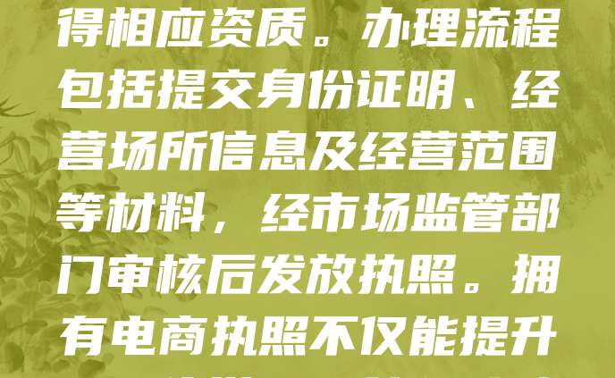 电商执照是开展线上经营活动的法定凭证,确保商家合法合规运营。根据电子商务法,从事电商需办理营业执照,并根据经营类型申请相关许可证。如销售食品、药品等特殊商品,还需取得相应资质。办理流程包括提交身份证明、经营场所信息及经营范围等材料,经市场监管部门审核后发放执照。拥有电商执照不仅能提升企业信誉,还能保障消费者权益,避免法律风险。随着电商行业快速发展,规范持证经营已成为行业趋势。商家应重视执照办理,确保业务合法有序进行,为长远发展奠定基础。