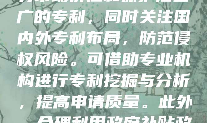 科技型中小企业应注重专利布局,围绕核心技术进行系统性申请,提升竞争力。优先申请具有市场价值和保护范围广的专利,同时关注国内外专利布局,防范侵权风险。可借助专业机构进行专利挖掘与分析,提高申请质量。此外,合理利用政府补贴政策,降低研发成本。通过有效专利管理,增强企业创新能力和市场壁垒,助力可持续发展。