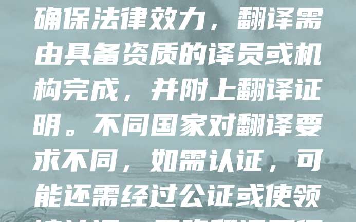 执照翻译是指将个人或企业持有的专业资格证书、执业许可证等文件,按照目标国家的语言和格式进行准确翻译。此类翻译常用于出国工作、升学或商务合作。为确保法律效力,翻译需由具备资质的译员或机构完成,并附上翻译证明。不同国家对翻译要求不同,如需认证,可能还需经过公证或使领馆认证。正确翻译不仅能避免误解,还能保障合法权益。因此,在进行执照翻译时,应选择专业服务,确保内容准确、格式合规,以顺利通过审核与使用。