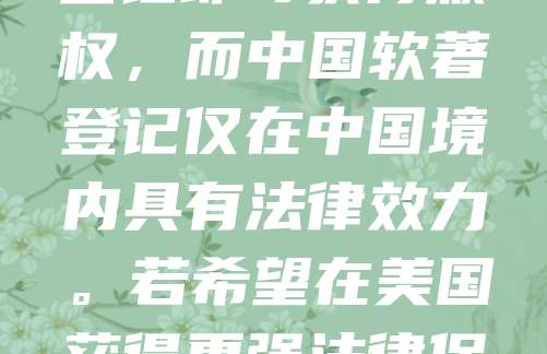 中国软件著作权在美国是否有效,取决于具体使用场景。根据伯尔尼公约,中国作为缔约国,其软件著作权在美国受保护。但美国实行“自动保护”原则,无需登记即可获得版权,而中国软著登记仅在中国境内具有法律效力。若希望在美国获得更强法律保护,建议在美国进行版权登记。此外,涉及跨境侵权时,需结合两国法律处理。因此,中国软著在美国有一定效力,但为保障权益,建议补充当地登记。