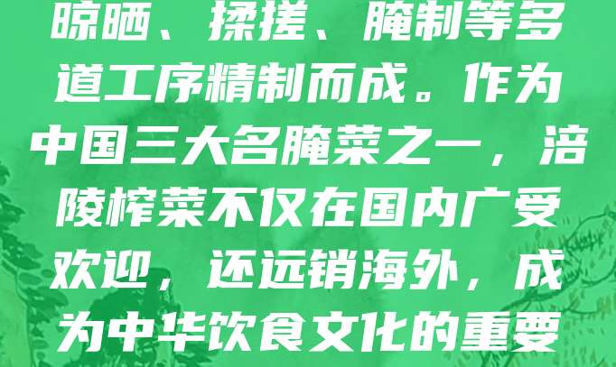 涪陵榨菜是中国国家地理标志产品,产于重庆市涪陵区。其历史悠久,风味独特,以鲜嫩清香、咸鲜适口著称。涪陵榨菜采用传统工艺腌制,选用优质青菜头,经晾晒、揉搓、腌制等多道工序精制而成。作为中国三大名腌菜之一,涪陵榨菜不仅在国内广受欢迎,还远销海外,成为中华饮食文化的重要代表。其地理标志认证,既是对品质的保障,也是对地方特色文化的传承与保护。涪陵榨菜不仅是一道美味佳肴,更是涪陵乃至重庆的一张文化名片。