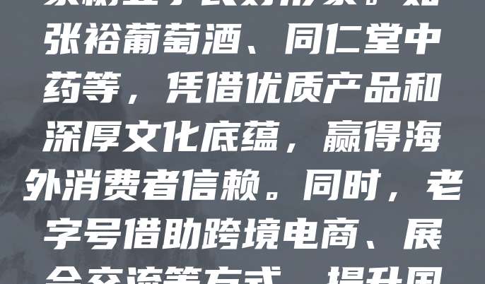 老字号企业作为中华文化的象征,正积极融入“一带一路”倡议,拓展国际市场。通过品牌输出、文化合作与产品推广,老字号在沿线国家树立了良好形象。如张裕葡萄酒、同仁堂中药等,凭借优质产品和深厚文化底蕴,赢得海外消费者信赖。同时,老字号借助跨境电商、展会交流等方式,提升国际影响力。未来,老字号将继续以传统工艺为根基,结合现代营销手段,推动中华文化“走出去”,助力“一带一路”高质量发展。