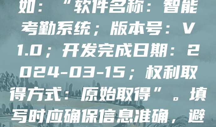 软件著作权申请表填写范例包括:软件名称、版本号、开发完成日期、权利取得方式等基本信息。申请人需填写姓名或单位名称、联系方式,并附上软件代码和文档。例如:“软件名称:智能考勤系统;版本号:V1.0;开发完成日期:2024-03-15;权利取得方式:原始取得”。填写时应确保信息准确,避免模糊表述。同时,需提交身份证明、软件鉴别材料等附件。规范填写有助于提高审核通过率,保护开发者权益。建议仔细阅读官方指南,确保符合要求。