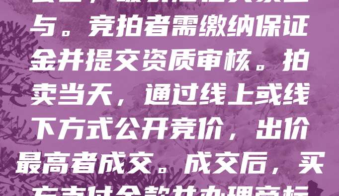 商标拍卖流程通常包括以下几个步骤:首先,商标所有人委托专业机构进行评估,并确定拍卖底价。随后,发布拍卖公告,吸引潜在买家参与。竞拍者需缴纳保证金并提交资质审核。拍卖当天,通过线上或线下方式公开竞价,出价最高者成交。成交后,买方支付余款并办理商标转让手续,最终由商标局完成变更登记。整个过程公开透明,确保交易合法有效,帮助商标资源合理流通。