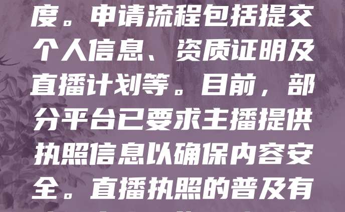 直播执照是开展网络直播活动的合法凭证,由相关部门审核发放。随着直播行业快速发展,国家加强对该领域的监管,要求主播及平台依法持证上岗。持有直播执照不仅能提升内容合规性,还能增强观众信任度。申请流程包括提交个人信息、资质证明及直播计划等。目前,部分平台已要求主播提供执照信息以确保内容安全。直播执照的普及有助于净化网络环境,推动行业健康发展。无论是个人主播还是企业,都应重视合规经营,避免因无证直播而面临法律风险。总之,直播执照是从业者必须了解的重要资质,是实现可持续发展的基础保障。