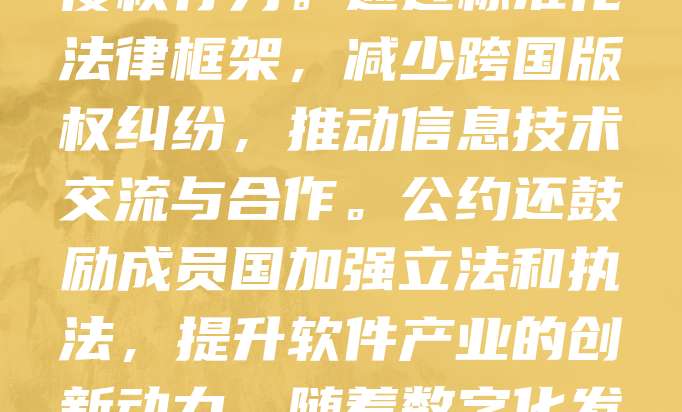 国际软著保护公约旨在促进全球软件著作权的统一保护,确保创作者权益。该公约要求缔约国相互承认和保护对方国家的软件作品,防止侵权行为。通过标准化法律框架,减少跨国版权纠纷,推动信息技术交流与合作。公约还鼓励成员国加强立法和执法,提升软件产业的创新动力。随着数字化发展,软著保护日益重要,公约成为国际合作的重要基础。各国应积极履行公约义务,共同维护公平竞争的国际软件市场。