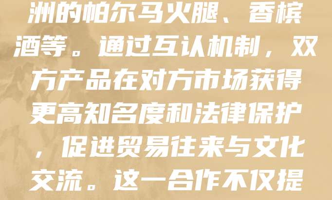 中欧地理标志互认名单是中欧双方在经贸合作中的一项重要成果,旨在保护和推广具有地域特色的优质产品。该名单涵盖食品、农产品及传统工艺品等,如中国的龙井茶、茅台酒,欧洲的帕尔马火腿、香槟酒等。通过互认机制,双方产品在对方市场获得更高知名度和法律保护,促进贸易往来与文化交流。这一合作不仅提升了消费者对高品质产品的认知,也推动了地方经济发展和品牌建设。中欧地理标志互认体现了双方深化合作、互利共赢的意愿,为全球地理标志保护提供了典范。