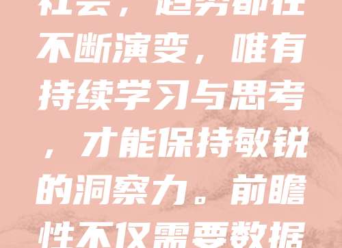 在快速变化的时代,趋势与前瞻性思维显得尤为重要。趋势是事物发展的方向,而前瞻则是对未来的预判与准备。把握趋势,有助于我们抓住机遇、规避风险。无论是科技、经济还是社会,趋势都在不断演变,唯有持续学习与思考,才能保持敏锐的洞察力。前瞻性不仅需要数据支持,更需结合直觉与经验。面对不确定性,提前布局、灵活应变,是应对未来挑战的关键。只有将趋势分析与前瞻规划相结合,才能在变革中立于不败之地,引领未来发展。