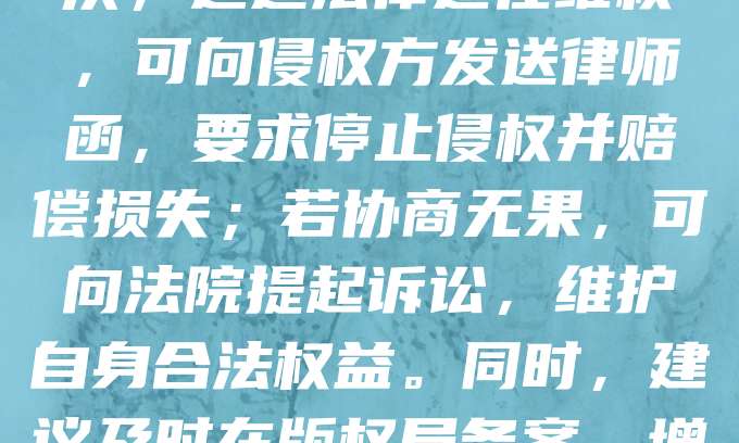 版权登记后若被盗用,应立即采取以下措施:首先,收集证据,如侵权内容截图、时间戳等;其次,通过法律途径维权,可向侵权方发送律师函,要求停止侵权并赔偿损失;若协商无果,可向法院提起诉讼,维护自身合法权益。同时,建议及时在版权局备案,增强维权力度。版权登记是保护原创的重要手段,发现侵权应及时应对,避免权益受损。