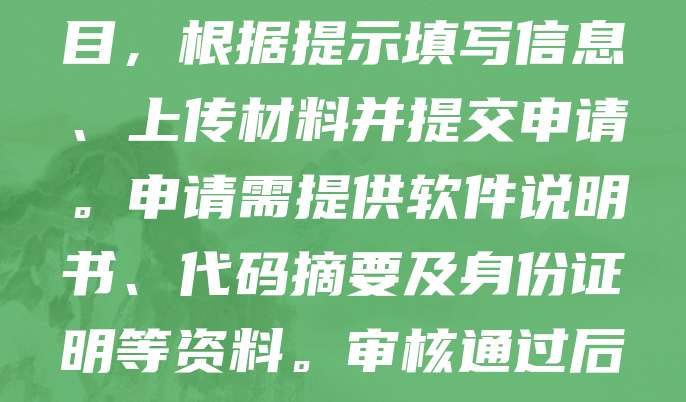 软著申请官网入口是“中国版权保护中心”官方网站(https://www.ccopyright.com.cn)。用户可在此网站进行软件著作权登记申请。进入官网后,点击“软件著作权登记”栏目,根据提示填写信息、上传材料并提交申请。申请需提供软件说明书、代码摘要及身份证明等资料。审核通过后,将获得计算机软件著作权登记证书。建议申请人提前熟悉申请流程,确保材料完整,以提高审核通过率。官网还提供在线查询、常见问题解答等服务,方便用户办理相关业务。