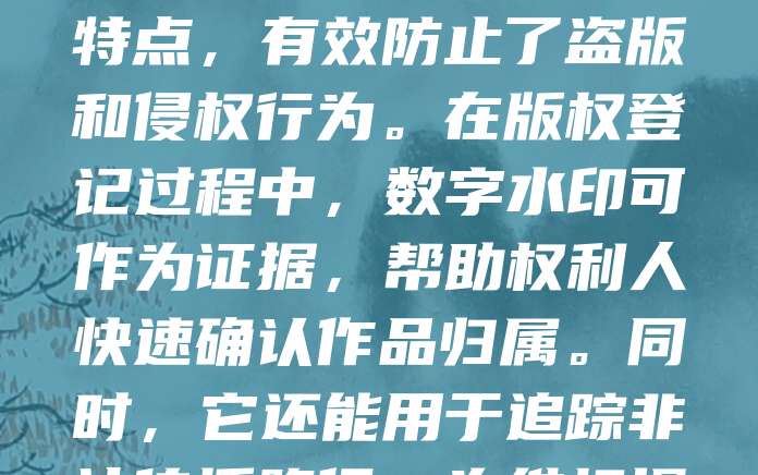 数字水印技术在版权登记中发挥着重要作用。通过将唯一标识信息嵌入数字作品中,可实现对作品来源和所有权的准确识别。这种技术具有隐蔽性强、难以篡改的特点,有效防止了盗版和侵权行为。在版权登记过程中,数字水印可作为证据,帮助权利人快速确认作品归属。同时,它还能用于追踪非法传播路径,为维权提供技术支持。随着数字内容的快速增长,数字水印已成为保障创作者权益的重要工具,推动了版权管理的智能化与高效化发展。