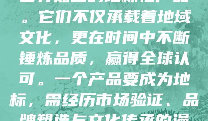 地标产品通常需要数十年甚至上百年的历史积淀,才能成为真正具有代表性的文化符号。例如,法国的香槟、中国的茅台酒,皆因悠久的历史与独特工艺而成为世界知名的地标性产品。它们不仅承载着地域文化,更在时间中不断锤炼品质,赢得全球认可。一个产品要成为地标,需经历市场验证、品牌塑造与文化传承的漫长过程。因此,地标产品往往需要至少50年以上的发展历程,才能真正深入人心,成为国家或地区形象的象征。历史赋予其价值,时间见证其经典。