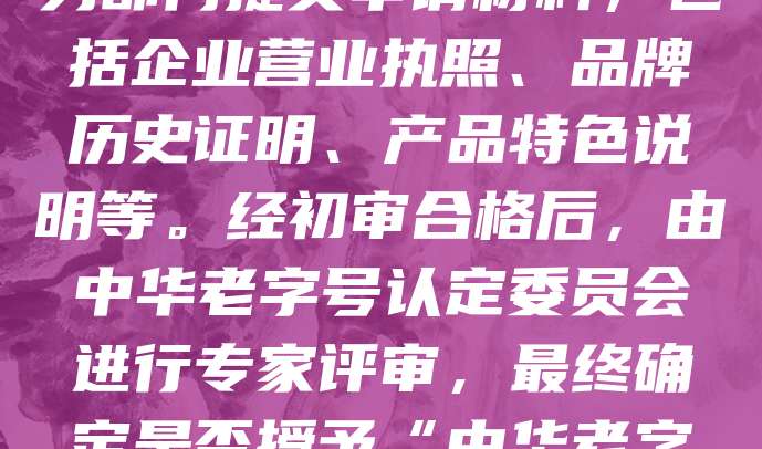 申请成为中华老字号需满足多项条件,包括品牌历史超过50年、具有独特工艺或文化价值、在市场上享有较高声誉等。申请人应向所在地商务部门提交申请材料,包括企业营业执照、品牌历史证明、产品特色说明等。经初审合格后,由中华老字号认定委员会进行专家评审,最终确定是否授予“中华老字号”称号。获得认证后,企业可提升品牌影响力,享受政策扶持。同时,需持续维护品牌质量与文化传承,确保老字号的长期发展。