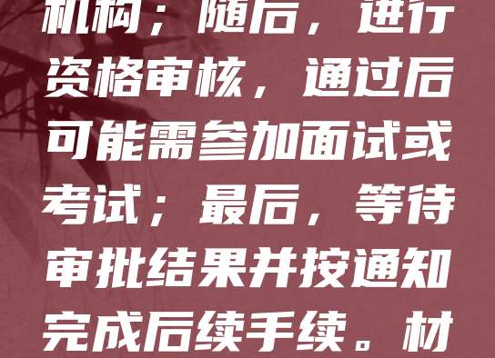 申请流程通常包括以下几个步骤:首先,确定申请目标并准备相关材料,如身份证、学历证明、推荐信等;其次,填写申请表并提交至相关部门或机构;随后,进行资格审核,通过后可能需参加面试或考试;最后,等待审批结果并按通知完成后续手续。材料应真实有效,确保申请顺利进行。整个过程需注意时间节点,避免因延误影响申请结果。合理规划时间、提前准备,是成功申请的关键。