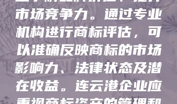 连云港作为江苏省重要的工业城市,商标品牌建设日益受到重视。商标评估在企业发展中具有关键作用,有助于企业了解品牌价值、提升市场竞争力。通过专业机构进行商标评估,可以准确反映商标的市场影响力、法律状态及潜在收益。连云港企业应重视商标资产的管理和评估,为融资、合作、维权提供依据。同时,政府也应加强政策支持,推动商标评估体系完善,助力企业高质量发展。