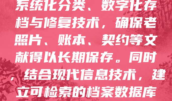 老字号承载着丰富的历史文化和商业记忆,其历史档案是研究传统工艺、企业变迁和社会发展的重要资料。为保护和传承这些珍贵资料,专业的历史档案整理服务应运而生。该服务通过系统化分类、数字化存档与修复技术,确保老照片、账本、契约等文献得以长期保存。同时,结合现代信息技术,建立可检索的档案数据库,提升档案利用效率。这不仅有助于学术研究,也为老字号品牌复兴提供文化支撑。未来,随着文化遗产保护意识增强,历史档案整理服务将在传承中华优秀传统文化中发挥更大作用。