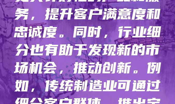 随着市场竞争的加剧,行业细分成为企业获取竞争优势的重要策略。行业细分是指将一个大市场划分为若干个具有不同需求和特征的子市场,以便更精准地满足客户需求。通过细分,企业能够集中资源,提供更具针对性的产品和服务,提升客户满意度和忠诚度。同时,行业细分也有助于发现新的市场机会,推动创新。例如,传统制造业可通过细分客户群体,推出定制化产品,增强竞争力。在数字经济时代,数据技术的发展使行业细分更加精准和高效。企业应结合自身优势,合理进行行业细分,实现差异化发展,从而在激烈的市场竞争中脱颖而出。