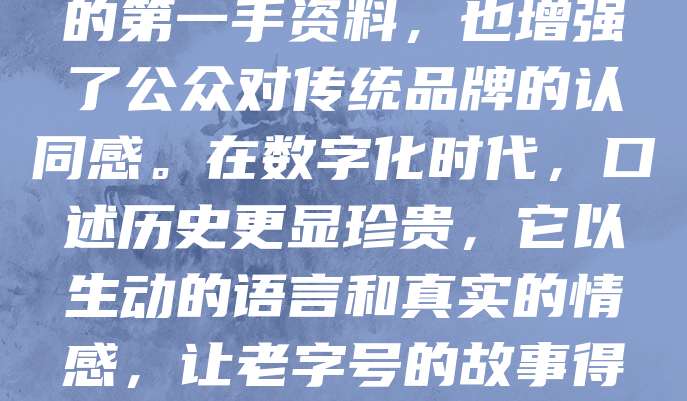 老字号承载着城市记忆与文化传承,其口述历史采集是保护非物质文化遗产的重要方式。通过访谈老匠人、经营者及顾客,记录企业发展历程、技艺传承与时代变迁,不仅保留了珍贵的第一手资料,也增强了公众对传统品牌的认同感。在数字化时代,口述历史更显珍贵,它以生动的语言和真实的情感,让老字号的故事得以延续。此过程需注重系统性与真实性,结合影像、文字与音频,构建全面的历史档案。老字号口述历史不仅是对过去的回顾,更是对未来的启示,助力传统文化在新时代焕发新生。