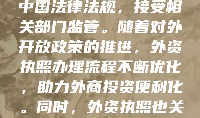 外资执照是指外国企业在我国设立分支机构或投资企业时,需依法取得的经营许可。它是企业合法开展业务的重要凭证,体现了国家对外资的规范管理。持有外资执照的企业,需遵守中国法律法规,接受相关部门监管。随着对外开放政策的推进,外资执照办理流程不断优化,助力外商投资便利化。同时,外资执照也关系到企业的税收、用工、进出口等多方面权益。企业应重视执照的申请与维护,确保合规经营,提升市场竞争力。外资执照不仅是法律要求,更是企业在中国市场长期发展的基础。