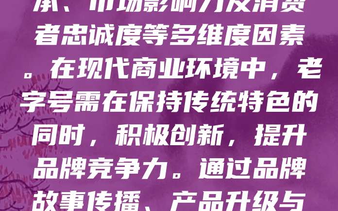 老字号品牌承载着深厚的文化底蕴与历史积淀,其价值不仅体现在经济层面,更蕴含着文化认同与情感连接。评估老字号品牌价值,需综合考虑品牌历史、文化传承、市场影响力及消费者忠诚度等多维度因素。在现代商业环境中,老字号需在保持传统特色的同时,积极创新,提升品牌竞争力。通过品牌故事传播、产品升级与数字化营销,增强品牌生命力。科学的品牌价值评估有助于老字号实现可持续发展,助力其在新时代焕发新生机,成为文化与商业的双重标杆。