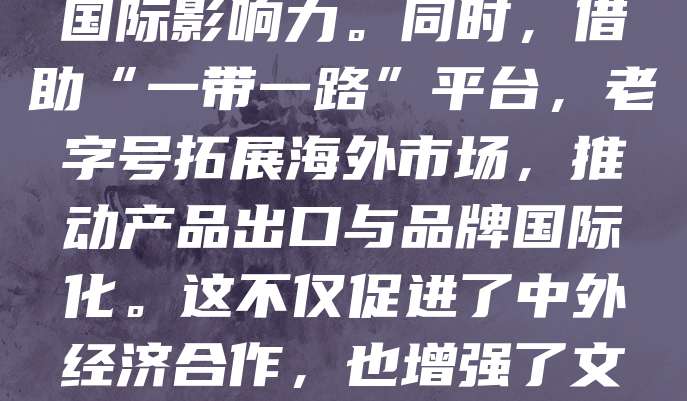 老字号企业作为中华文化的象征,在“一带一路”倡议中发挥着重要作用。通过文化交流与贸易合作,老字号品牌将传统工艺与文化魅力传播至沿线国家,提升国际影响力。同时,借助“一带一路”平台,老字号拓展海外市场,推动产品出口与品牌国际化。这不仅促进了中外经济合作,也增强了文化认同与互信。未来,老字号应深化创新,结合现代营销手段,进一步扩大在“一带一路”沿线国家的市场份额,让世界更好地了解中国传统文化与品质。