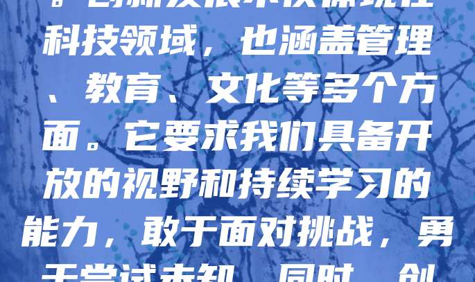 创新发展是推动社会进步的关键动力。在科技迅猛发展的今天,创新已成为国家竞争力的核心。只有不断突破传统思维,勇于探索新技术、新理念,才能在激烈的竞争中立于不败之地。创新发展不仅体现在科技领域,也涵盖管理、教育、文化等多个方面。它要求我们具备开放的视野和持续学习的能力,敢于面对挑战,勇于尝试未知。同时,创新需要良好的环境支持,包括政策引导、资金投入和人才培育。只有全社会共同努力,才能营造出有利于创新的生态,激发更多创造力,推动经济高质量发展,实现可持续未来。