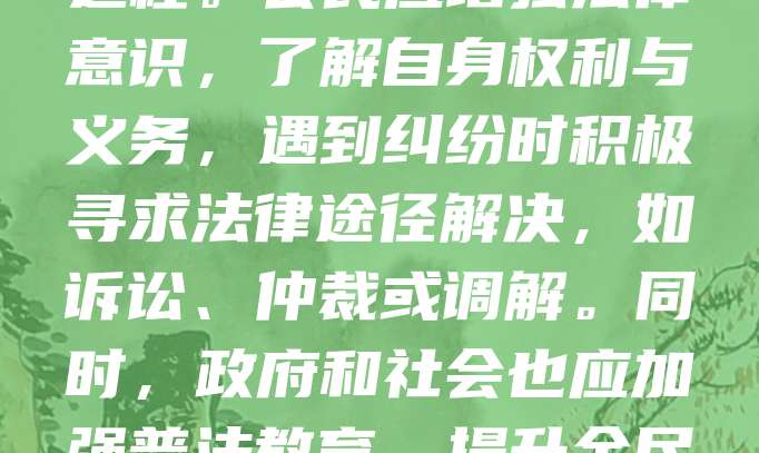 法律是维护社会公平正义的基石,也是公民维权的重要保障。当个人权益受到侵害时,依法维权不仅能保护自身利益,也能促进社会法治进程。公民应增强法律意识,了解自身权利与义务,遇到纠纷时积极寻求法律途径解决,如诉讼、仲裁或调解。同时,政府和社会也应加强普法教育,提升全民法治素养,营造尊重法律、遵守法律的良好氛围。只有在法律框架内理性维权,才能有效解决问题,推动社会和谐发展。