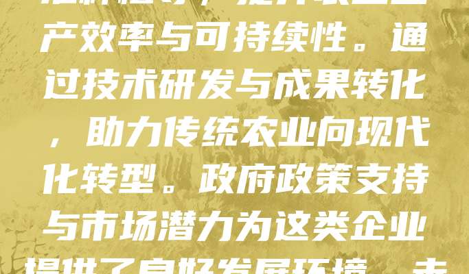 农业科技型中小企业项目是推动现代农业发展的重要力量。这类企业聚焦于农业科技创新,如智能装备、生物技术、精准种植等,提升农业生产效率与可持续性。通过技术研发与成果转化,助力传统农业向现代化转型。政府政策支持与市场潜力为这类企业提供了良好发展环境。未来,随着乡村振兴战略的推进,农业科技型中小企业将在保障粮食安全、促进农民增收方面发挥更大作用。