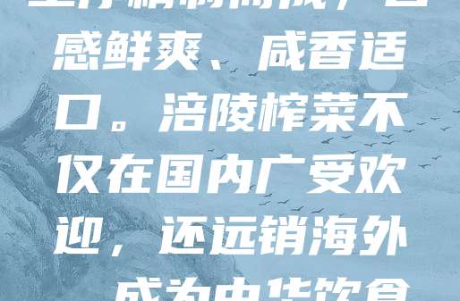 涪陵榨菜是中国国家地理标志产品,产于重庆市涪陵区。其历史悠久,以独特风味和精湛工艺闻名。选用优质青菜头,经腌制、晾晒、发酵等多道工序精制而成,口感鲜爽、咸香适口。涪陵榨菜不仅在国内广受欢迎,还远销海外,成为中华饮食文化的重要代表。作为地理标志产品,涪陵榨菜的品质与产地紧密关联,体现了地域特色与传统技艺的结合,是地方经济与文化的重要象征。