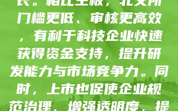科技型中小企业在北交所上市,是推动科技创新与资本市场深度融合的重要举措。北交所聚焦服务创新型中小企业,为科技企业提供融资新渠道,助力其加速成长。相比主板,北交所门槛更低、审核更高效,有利于科技企业快速获得资金支持,提升研发能力与市场竞争力。同时,上市也促使企业规范治理、增强透明度,提升品牌影响力。未来,随着政策持续支持与市场机制不断完善,更多科技型中小企业将借力北交所实现跨越式发展,为经济高质量发展注入新动能。