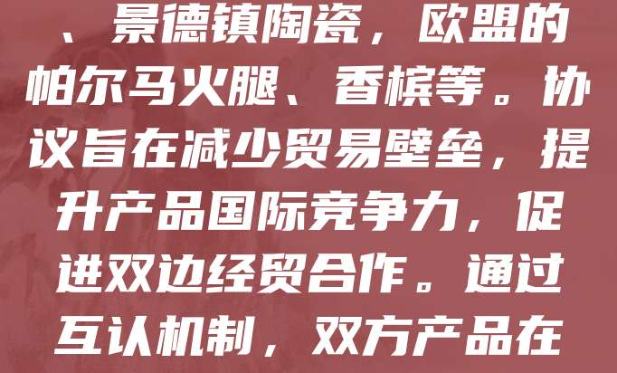 中欧地理标志互认协议于2021年3月1日正式生效,标志着中国与欧盟在保护地方特色产品方面迈出重要一步。该协议首批纳入双方各100个地理标志产品,涵盖食品、酒类、农产品等,如中国的西湖龙井、景德镇陶瓷,欧盟的帕尔马火腿、香槟等。协议旨在减少贸易壁垒,提升产品国际竞争力,促进双边经贸合作。通过互认机制,双方产品在对方市场获得更有力的法律保护,消费者也能更便捷地识别和购买正宗优质产品。这一协议不仅推动了中欧经贸关系发展,也助力全球地理标志保护体系完善,体现了开放包容的国际合作精神。