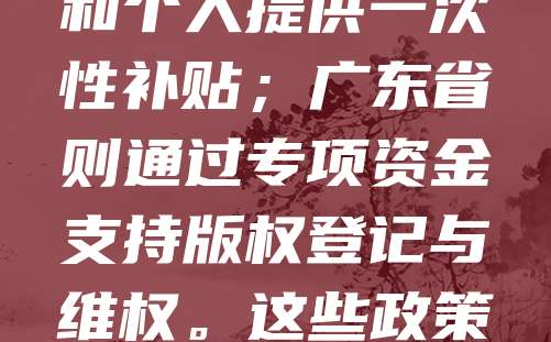 版权登记补贴政策旨在鼓励创作者积极进行作品登记,提升知识产权保护意识。不同地区根据自身情况出台相应补贴措施,如北京市对个人和企业登记作品给予一定比例的费用减免;上海市对符合条件的单位和个人提供一次性补贴;广东省则通过专项资金支持版权登记与维权。这些政策通常要求申请人具备合法著作权,并按规定提交相关材料。申请流程一般包括在线申报、审核公示、资金发放等步骤。补贴政策不仅降低了创作成本,也促进了文化产业健康发展,是推动创新的重要举措。