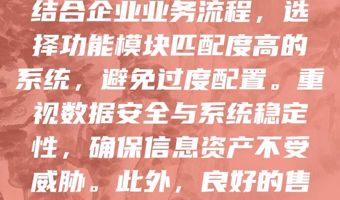 科技型中小企业在选择ERP系统时,应注重系统的灵活性、可扩展性与成本效益。优先考虑云ERP,便于快速部署和按需扩容。同时,需结合企业业务流程,选择功能模块匹配度高的系统,避免过度配置。重视数据安全与系统稳定性,确保信息资产不受威胁。此外,良好的售后服务与技术支持也是重要考量因素。通过科学评估,企业可选到适合自身发展的ERP系统,提升管理效率,助力创新发展。