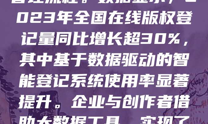 近年来,随着大数据技术的快速发展,数据分析在版权登记中的应用日益广泛。通过大数据分析,可以更高效地识别侵权行为、追踪作品传播路径,并优化版权管理流程。数据显示,2023年全国在线版权登记量同比增长超30%,其中基于数据驱动的智能登记系统使用率显著提升。企业与创作者借助大数据工具,实现了版权保护的精准化与自动化。未来,随着人工智能与大数据的深度融合,版权登记将更加智能化、透明化,为知识产权保护提供更强有力的技术支撑。