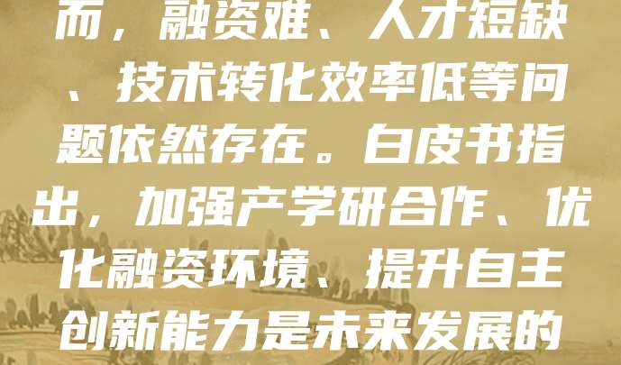 科技型中小企业是推动经济创新的重要力量。近年来,随着国家政策支持与市场需求增长,这类企业快速发展,在人工智能、大数据、新能源等领域表现突出。然而,融资难、人才短缺、技术转化效率低等问题依然存在。白皮书指出,加强产学研合作、优化融资环境、提升自主创新能力是未来发展的关键。同时,数字化转型成为提升竞争力的核心路径。政府应进一步完善服务体系,助力科技型中小企业成长,为经济高质量发展注入持续动力。