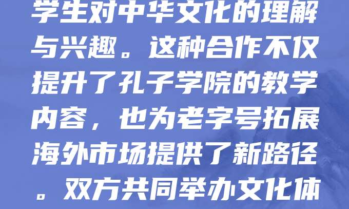 近年来,老字号企业与孔子学院携手合作,推动中华文化“走出去”。通过资源共享、课程共建等方式,老字号将传统技艺、品牌文化融入汉语教学,增强国际学生对中华文化的理解与兴趣。这种合作不仅提升了孔子学院的教学内容,也为老字号拓展海外市场提供了新路径。双方共同举办文化体验活动,如茶艺、书法、传统美食制作等,让世界更直观地感受中国魅力。未来,这种合作将持续深化,助力中华文化在全球传播,实现文化与商业的双赢。