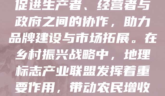 地理标志产业联盟是推动地方特色产业发展的重要平台,通过整合资源、共享信息、规范标准,提升地理标志产品的市场竞争力。该联盟促进生产者、经营者与政府之间的协作,助力品牌建设与市场拓展。在乡村振兴战略中,地理标志产业联盟发挥着重要作用,带动农民增收、保护传统技艺,推动区域经济高质量发展。未来,应加强政策支持与技术创新,进一步释放地理标志的经济与文化价值。