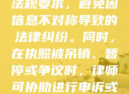 执照法律咨询服务是为个人或企业提供关于各类执业资格、行业许可证等法律事务的专业指导。随着法律法规的不断更新,许多从业者在申请、续期或变更执照时面临复杂流程与合规风险。专业咨询可帮助客户准确理解法规要求,避免因信息不对称导致的法律纠纷。同时,在执照被吊销、暂停或争议时,律师可协助进行申诉或诉讼,维护客户合法权益。此类服务不仅提升合规效率,也降低经营风险,尤其适用于医疗、教育、建筑、金融等行业。选择正规法律机构提供咨询服务,能确保信息准确、流程合法,助力企业稳健发展。