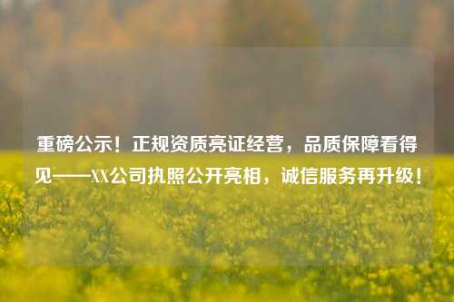 重磅公示!正规资质亮证经营,品质保障看得见——XX公司执照公开亮相,诚信服务再升级!
