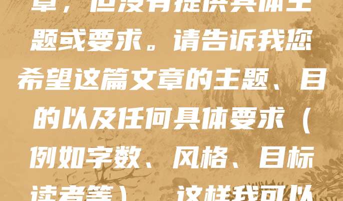 您似乎想让我写一篇文章,但没有提供具体主题或要求。请告诉我您希望这篇文章的主题、目的以及任何具体要求(例如字数、风格、目标读者等)。这样我可以更好地为您提供帮助。